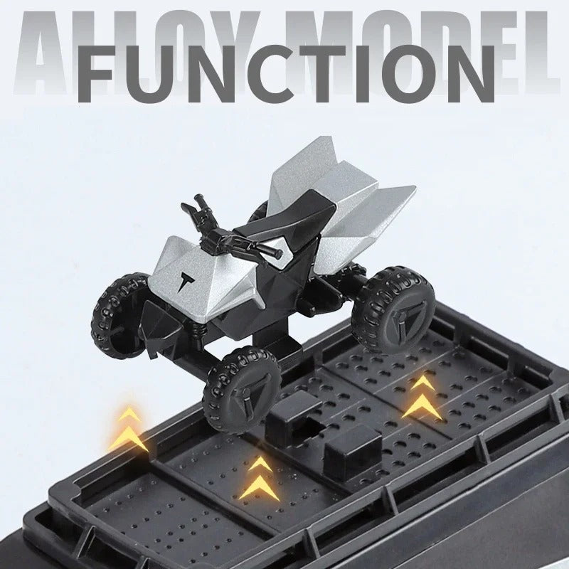 A futuristic 1:32 Tesla Cybertruck RV diecast model with a unique camping-style roof module. Featuring pull-back action, opening doors, and a detailed sci-fi aesthetic—perfect for collectors and kids who love imaginative play.